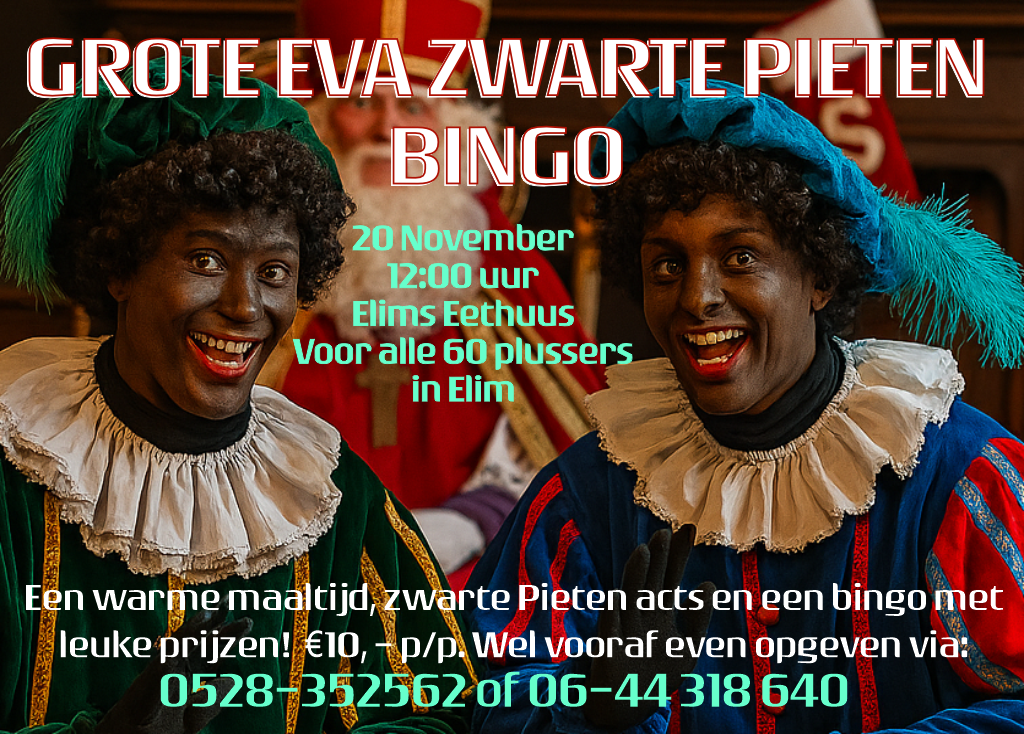 ELIM – Op donderdag 20 november om 12:00 uur organiseert Elim Vitaal & Actief (EVA) in ‘t Elims Eethuus een bijzondere middag voor alle 60-plussers uit Elim: de Grote Eva Zwarte Pieten Bingo. Deelnemers worden getrakteerd op een warme maaltijd, vrolijke Zwarte Pieten acts en een spannende bingo met leuke prijzen.