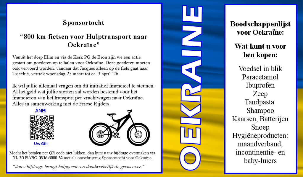 ELIM – Vanochtend vroeg is Jacques Severin vanaf de Protestantse Gemeente De Bron in Elim vertrokken voor een indrukwekkende sponsortocht van maar liefst 800 kilometer. Op de fiets reist hij richting Tsjechië, als onderdeel van een groter hulptransport dat uiteindelijk Oekraïne moet ondersteunen. De actie wordt georganiseerd in samenwerking met de Friese Rijders, een stichting die al jarenlang humanitaire hulp naar Oost‑Europa brengt.