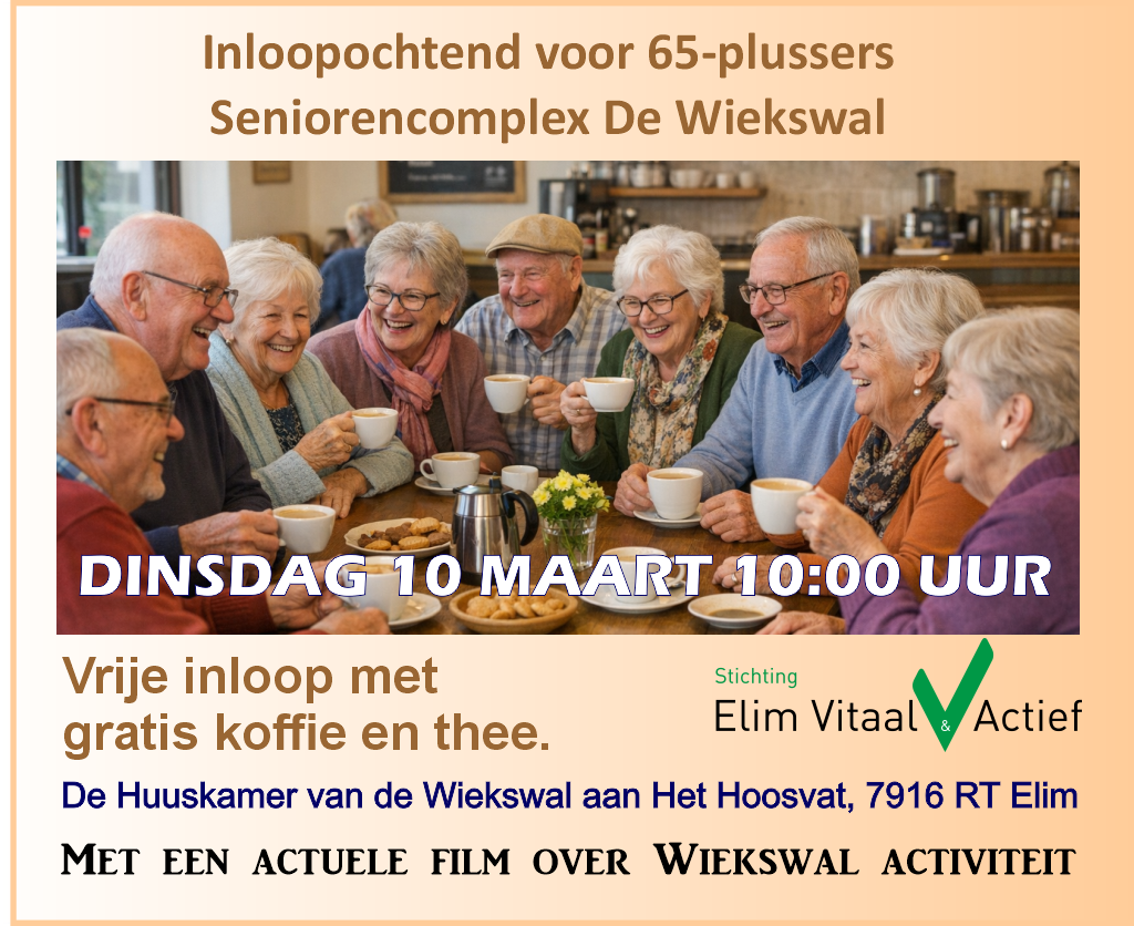 ELIM – Dinsdag 10 maart Aanvang: 10:00 uur tot 11:30 uur. Kom gezellig langs voor een kopje koffie of thee, een praatje en een fijne ochtend samen. Iedereen van 65 jaar en ouder is van harte welkom. Vrije inloop en de koffie en thee zijn gratis. Er is ruimte om elkaar te ontmoeten, vragen te stellen en gewoon even gezellig samen te zijn. Opgave is niet nodig! We zien u graag in De Huuskamer! Van de Wiekswal. Opgeven is niet nodig, kom gewoon even gezellig buurten. Het thema van EVA is tenslotte verbinding.